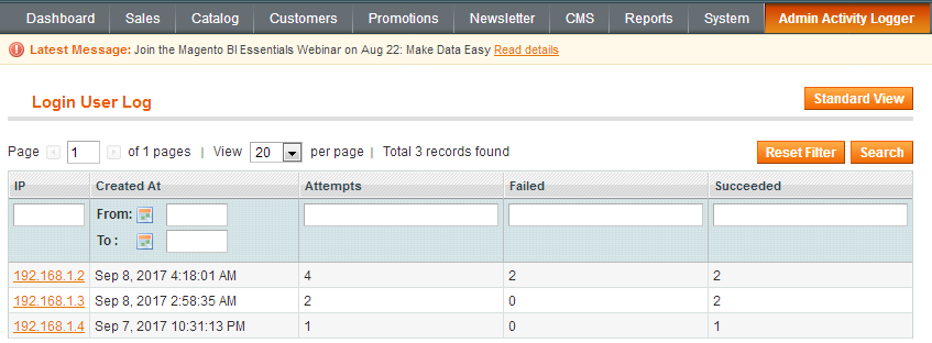 This extension will automatically delete your all activity logs after the number of days specified by the store administrator. With the advance, back-end configurations store admin can download all activity logs in XML or CSV files.
