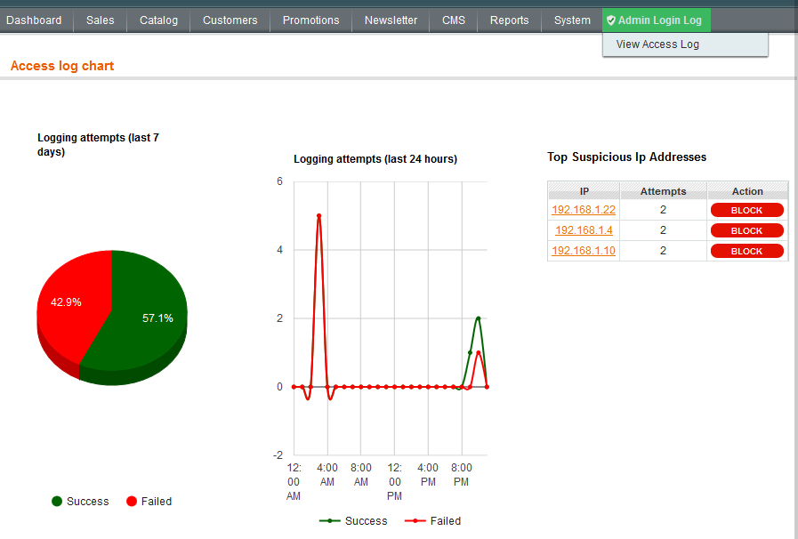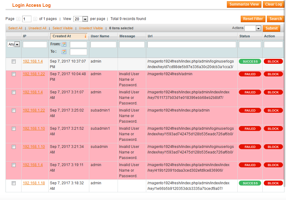 If any suspicious IP address tries to login into your store admin panel, this extension adds a table view of the top suspicious IP address in a backend. The Login access log grid display information like IP address, attempts count, status, IP address status (block or unblocked) and URL. The failed request log gets a highlight with different red warning background colour.