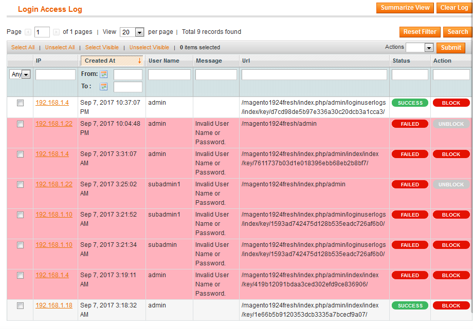 - Login access log grid display information like IP address, attempts count, status, IP address status (block or unblocked) and URL