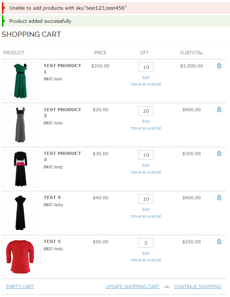 - Here you'll get error notification if you enter qty or SKU is not available or product is 'out of stock'