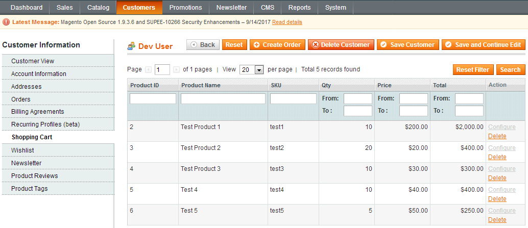 - Here in the backend, you can get shopping cart related information like Product Id, Product name, SKU, Qty, Price, Total etc.