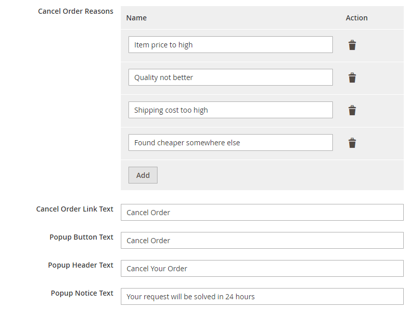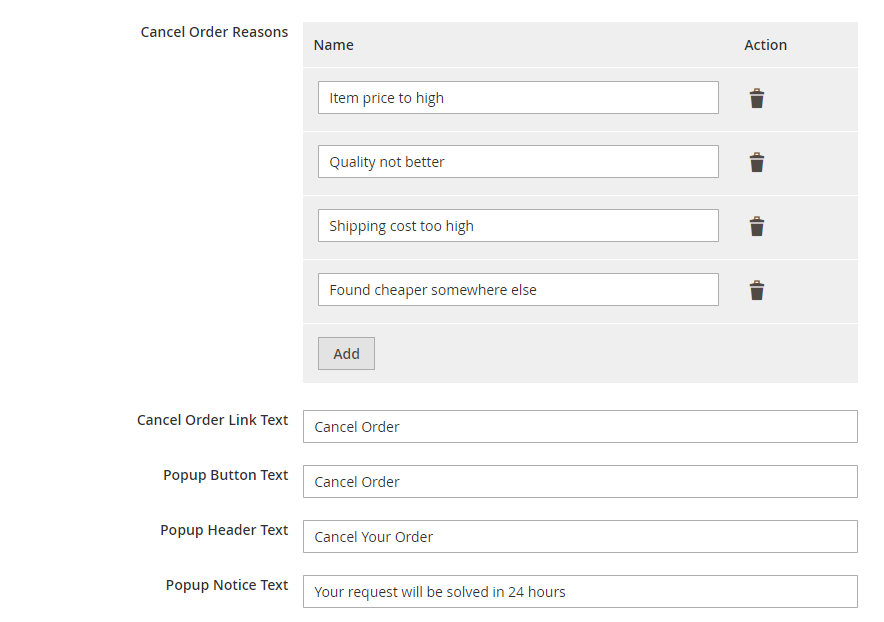 - By using Cancel Order action a customer can easily cancel their order by themselves.