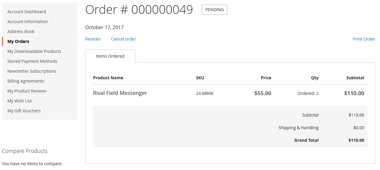 - A customer can also Cancel order from order detail page by using action.