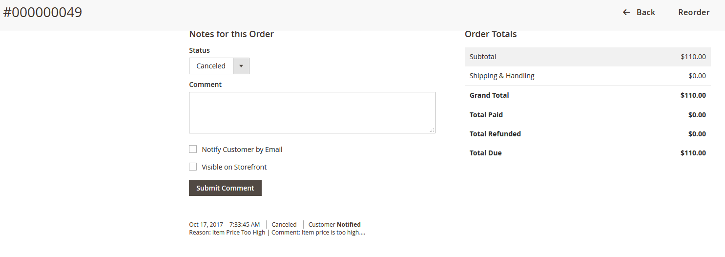 - Admin can view all necessary information like Order ID, Status, Reason, Comment and order total.