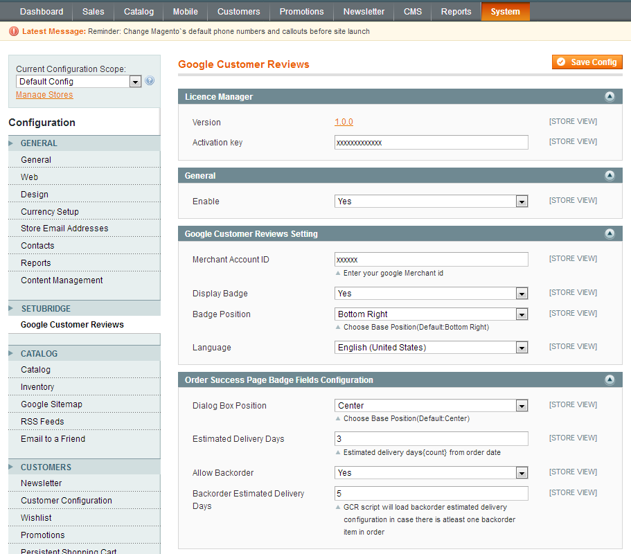 Easy Installation & Activation right from backend, To use this Google Customer Reviews extension you have to Go to STORES> Configuration > SETUBRIDGE > Google Customer Reviews Tab:
