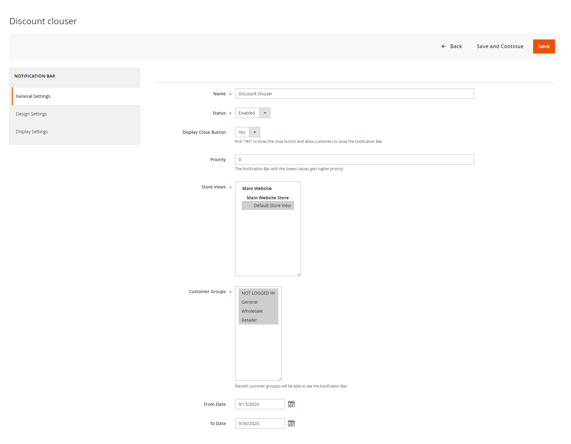 - The smart extension allows the admin to schedule the notification bar with start and end dates and also set their priorities. The bar with the least number (1) holds the highest priority. Further, the extension allows the admin to display the notification bar to specific/all customer groups or pages. Admin can also select to show/hide a close button for the notification bar.