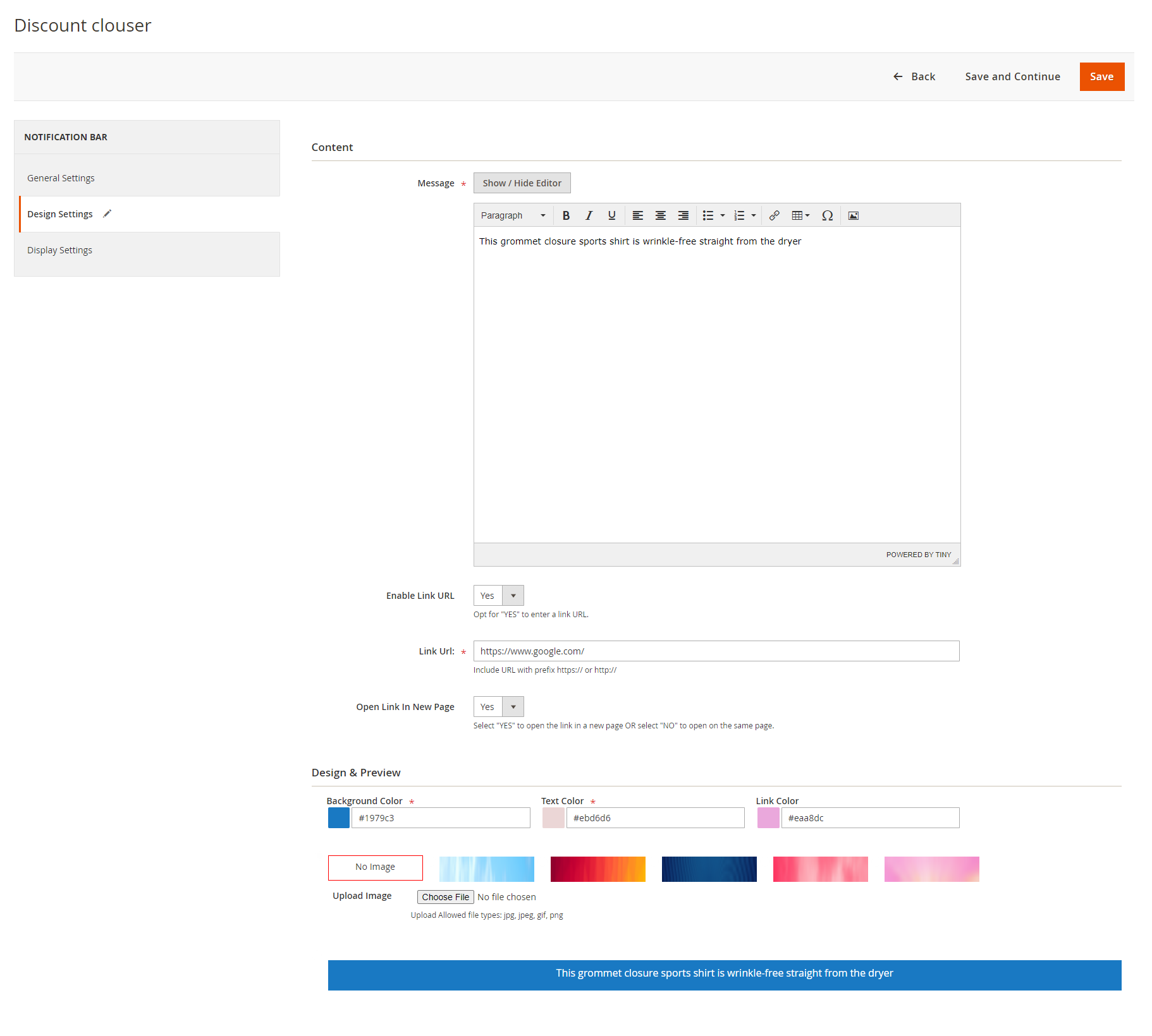 - Notification Content: The admin can design promo bars using a WYSIWYG editor. The extension allows admin to enable and enter the Url link, thus redirect the interested victor to the linked page.