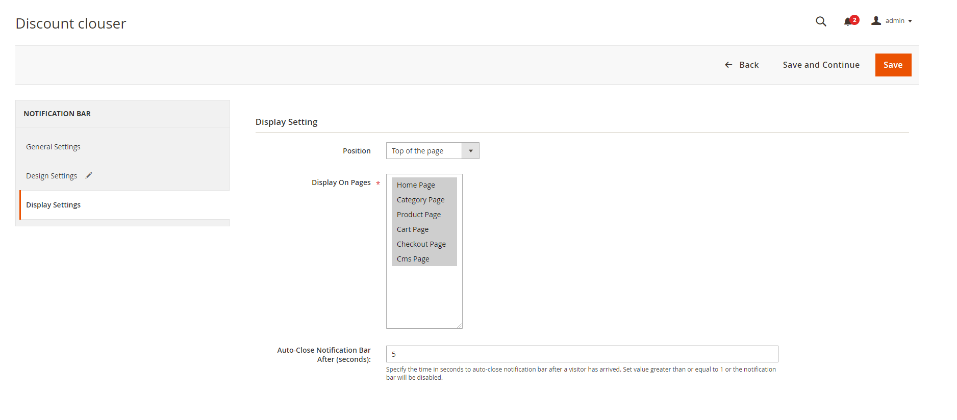- Display Settings: The extension offers 3 predefined positions: Top of the page, Bottom of the page, and Top of the content (bottom of the menu bar). Admin can select any of the mentioned positions of the promo bar. Along with this, admin can also select pages to display promo bars.