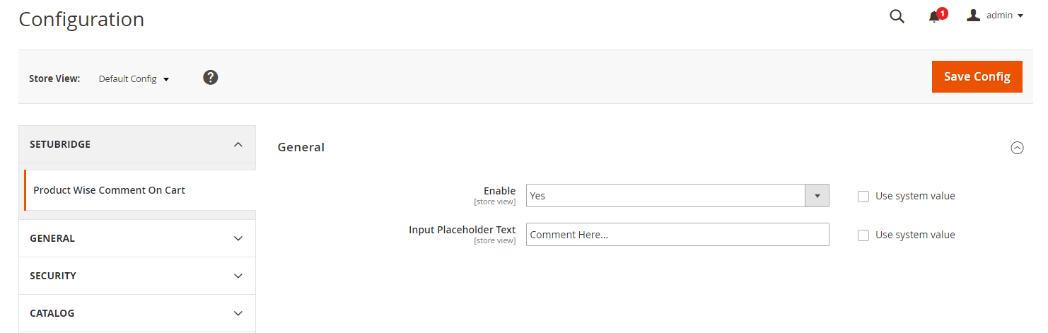 To use this Product Wise Comment On Cart you have to Go to STORES > Configuration > SETUBRIDGE > Product Wise Comment On Cart Tab: