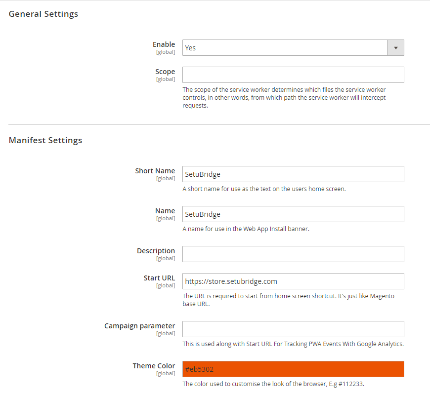To use this Progressive Web Apps you have to Go to STORES > Configuration > SETUBRIDGE > Progressive Web Apps Tab: