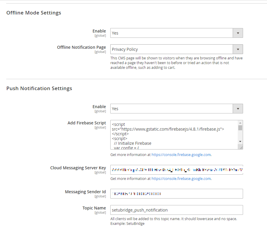 - The offline mode on this module can be enabled or disabled in accordance with the given configuration. In case, offline mode is selected an admin can set a CMS page to for the offline mode. One can add a Firebase Script, Server key, and Messaging Sender ID generated by your firebase account.