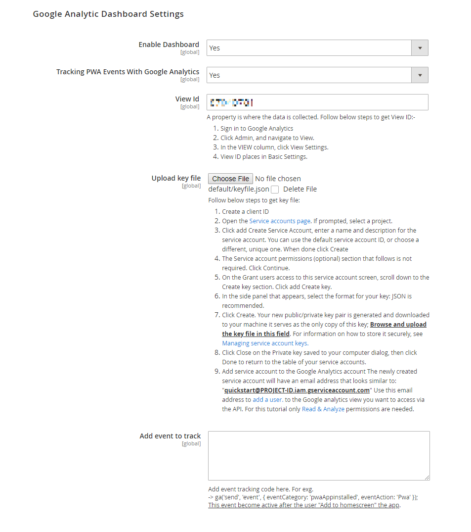 - Add Google analytics code to your PWA app for tracking events & analytic dashboard. Add "View ID" to access your Google analytics dashboard to your store back-end.