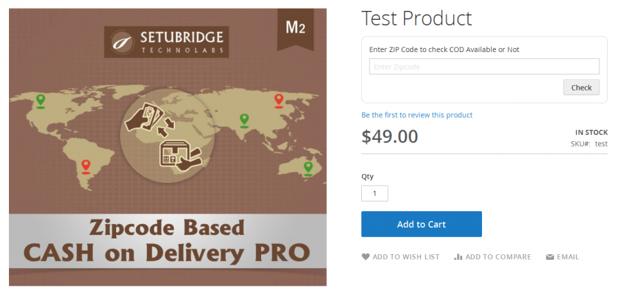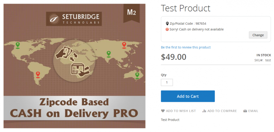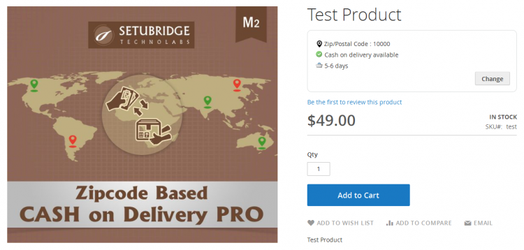 A mobile responsive postcode/zipcode availability checker tool on the product detail page will enhance the user experience by helping the user whether or not cash on delivery is available to specific postcodes entered by the user. The cash on delivery checker widget will display a 'estimated delivery time' message for eligible postcodes which can be configured for each Zipcode/Pincode/Postcodes.