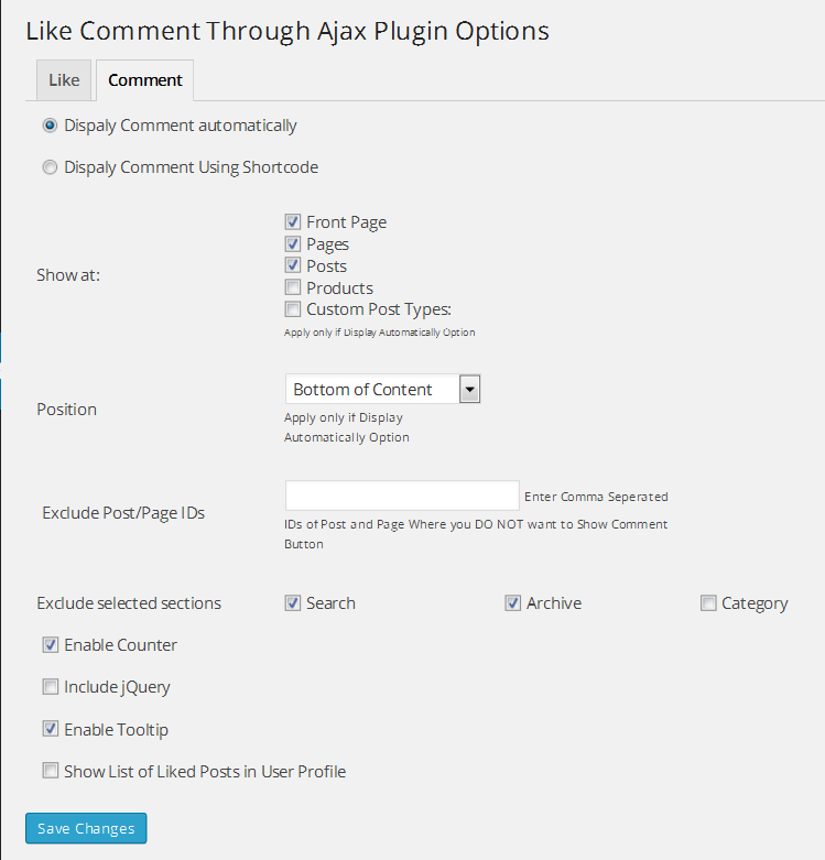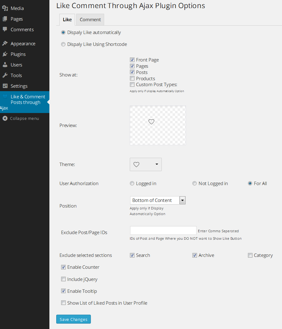 Add a Like Button and Comment Button to posts, pages, Front Page,WooCommerce Products, custom post types. It allows visitors to like and dislike content anonymously. Also allow Ajax through Comment in listing page of post & Pages. This Plugin Provide Facility to add Widget displaying most liked content. It also Support shortcode to display Like and Comment on Post/Page/Product as well as Custom post types. You can Exclude Some section where you don't want to display Like or Comment. You can choose Your own Icons for Like button and show its real time preview. It supports: the frontpage, posts, pages and custom-post-types.