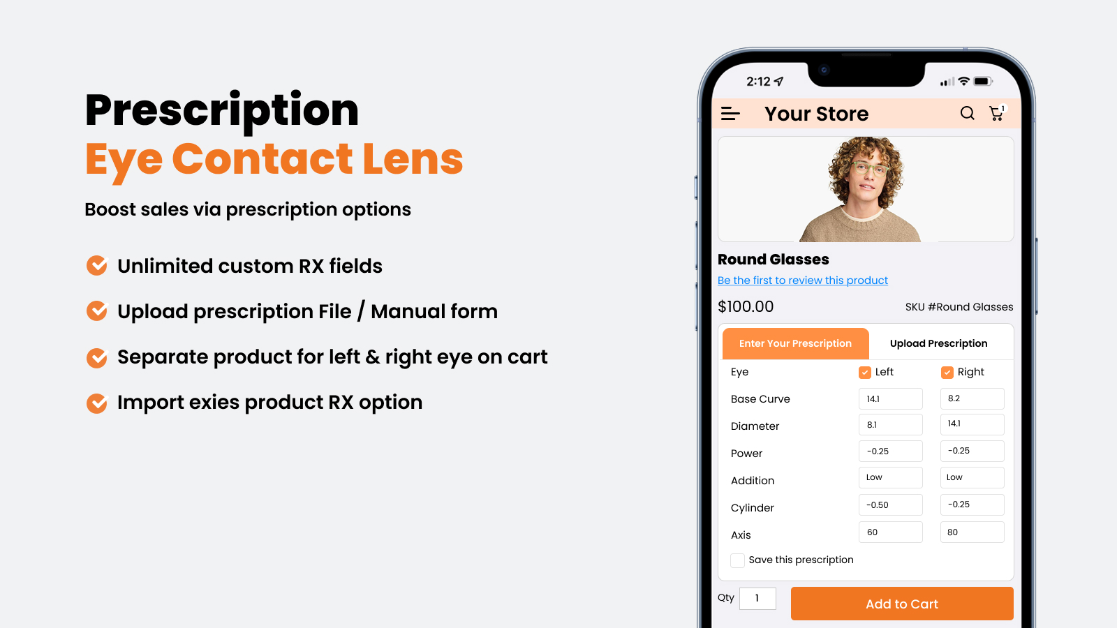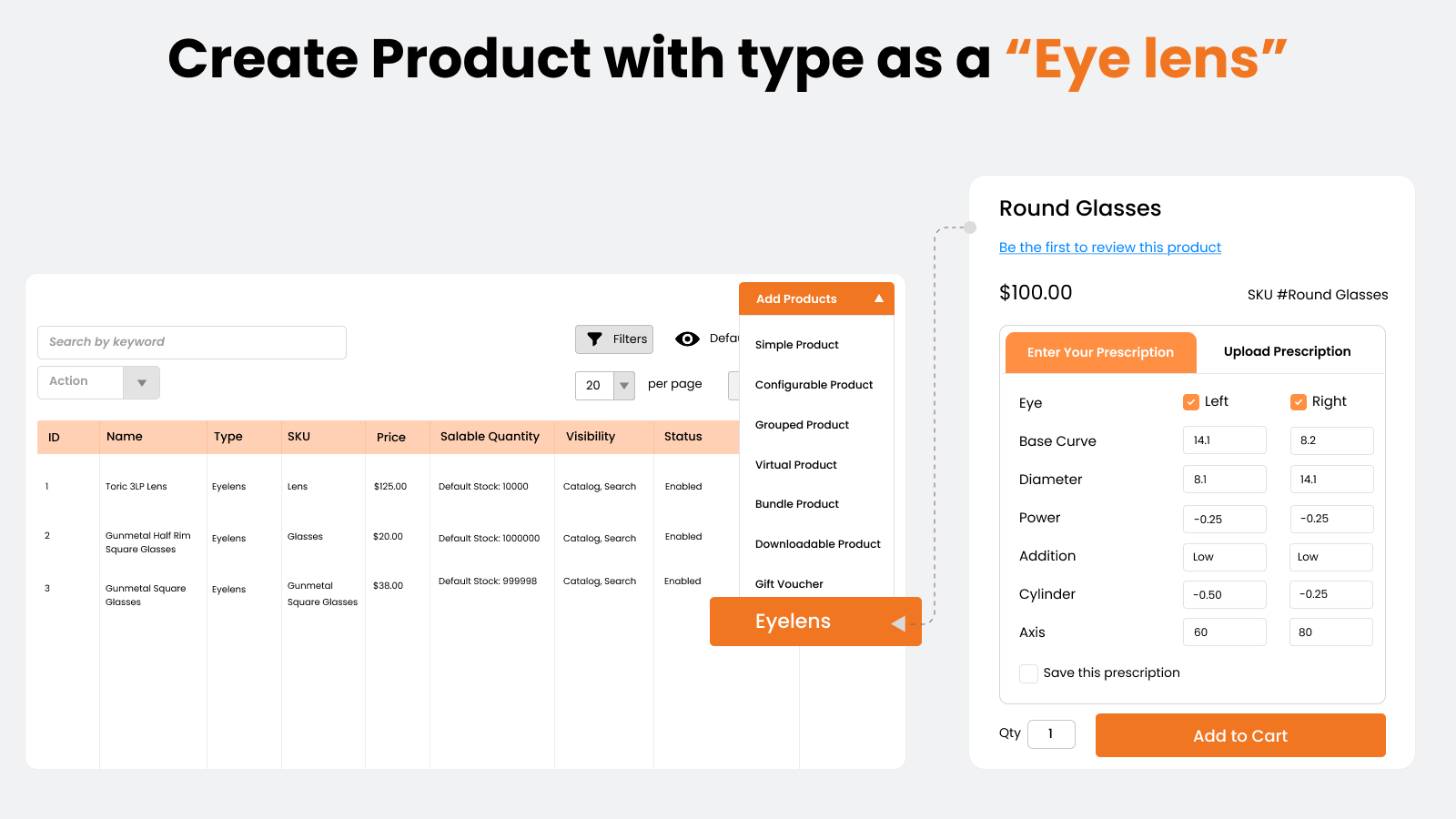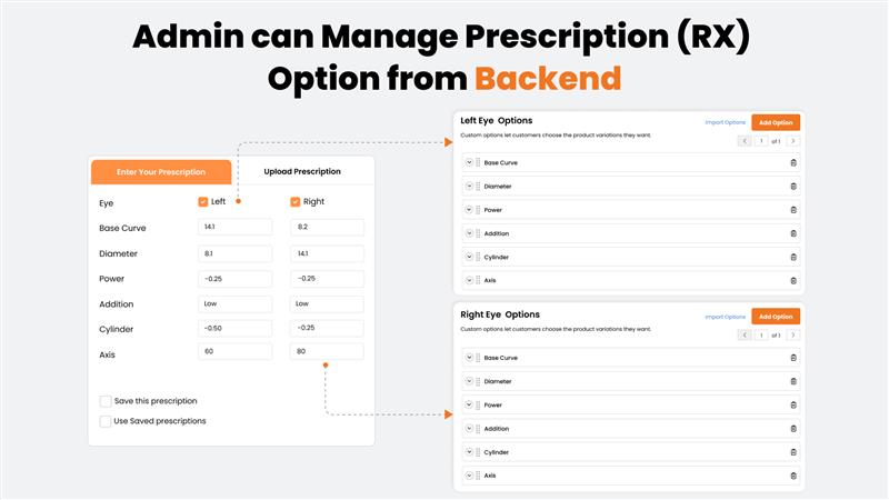 Magento eye lens prescription extension is a smart eyeglass and eye lens configurator extension that helps to create an online sunglasses/eye lens selling store. Prescription lens configurator extension helps your customers to create eye contact lens type products based on the Power, Cylinder, Axis, Base curve & Diameter of both the eyes.