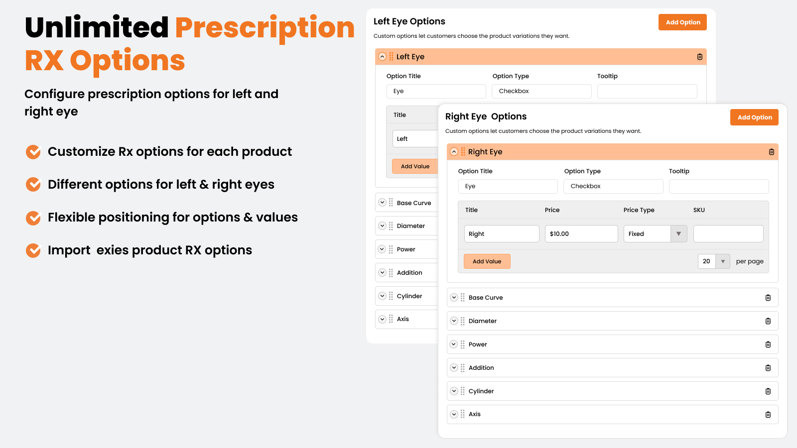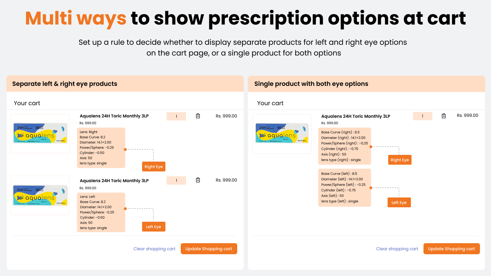 - All configuration is supported for a single eye lens product or both, on the same page