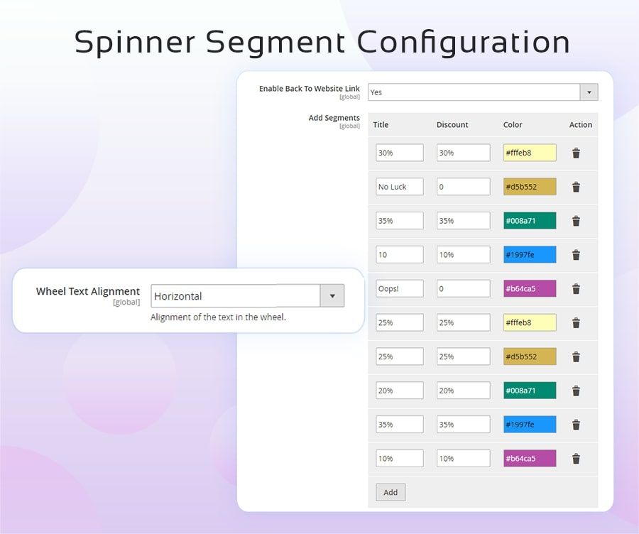 - Adjust the wheel’s colors, fonts, and segment patterns from the backend to fit your brand’s aesthetics and promotional needs.