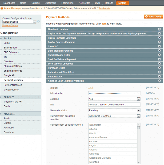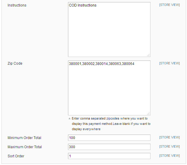 The admin can decide whether or not the shipping service is available for a specific location by listing down the zip/postal codes. This will auto-hide the payment method when the zip/postal code is not available in the allowed zipcode list from the admin panel. This extension allows the admin to add/update/delete zipcodes for the Cash On Delivery method. Additionally, there is a backend configuration to set the minimum order total & maximum order total.